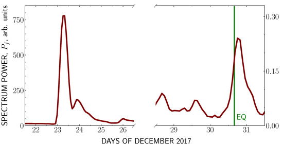 Figure 8 presents the resulting distribution of the integral power values of the dynamic spectra calculated according to the method described for the keV channel of the underground gamma detector over a few days around the 30 December 2017 earthquake. As follows from the left plot of this figure, at the peak of the gamma ray outburst on 23–24 December, the integral power of the dynamic variation spectrum was ∼8000 times above the background. A much smaller, but noticeable, increase in the spectrum power, 2.7 times above the mean square level of its background fluctuation, is also seen in the right plot of the same figure both before and after the earthquake moment. According to these high-sensitivity data, the gamma radiation flux still remained disturbed during the whole next day after the seismic event.