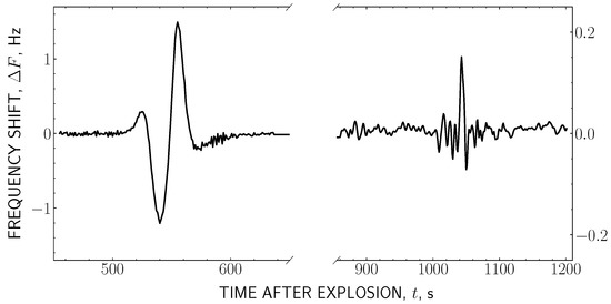 A confirmation of the mechanism of disturbance propagation into the ionosphere stimulated by the rise of radioactivity in the near-surface atmosphere was obtained via a retrospective analysis of the Doppler shift records, which were done during the underground nuclear explosions in the 1980s at the Semipalatinsk testing site in Kazakhstan. In Figure 10, an original time history of Doppler shift values is presented, which was acquired on 19 October 1989 after a 75 kt TNT equivalent explosion. The Doppler ionosonde was placed at the testing site, such that the radio wave reflection point in the ionosphere was situated immediately above the epicenter. It is seen in Figure 10 that 510 s (8.5 min) after the explosion, a large perturbation appears in the time series of Doppler frequency caused by the penetration of the intensive acoustic wave into the ionosphere. The source of this wave is the movement of the earth’s surface within the splitting zone of the explosion. Later on, at the time mark of 1005 s (16.75 min), another, essentially weaker, disturbance is present in the Doppler shift record.