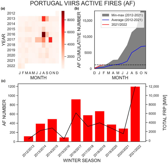 VIIRS data: (a) active fires between December 2012 and February 2022; (b) monthly cumulative active fires, dashed line indicates the winter 2021/2022 AF number; (c) seasonal cumulative number of active fires (red columns, left Y-axis) and Fire Radiative Power (FRP; black line, right Y-axis) for 10 wintertime periods.