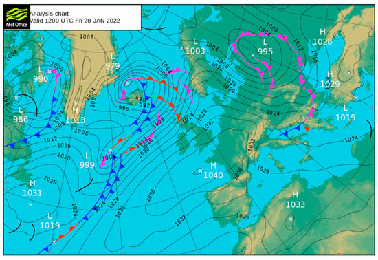 Synoptic chart of surface pressure showing the large-scale pattern over Europe on 28 January 2022 at 1200 UTC. Figure indicates the mean sea level pressure (black contour), cold front (blue line), warm front (red line) and occluded front (purple line). Source: [30].