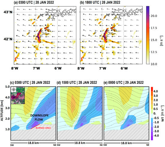 The effect reproduced by the model is similar to those documented for mountainous regions, with intense winds on the lee side, e.g., [15,47]. These orographic effects depend on mountain geometry, wind direction, and air stability, e.g., [49]. Near the surface, a high-pressure system centred over the Biscay Gulf induced the easterly flow over the northwest of the Iberian Peninsula. The orographic effects created by the complex terrain produced intense downslope winds where the fire occurred. Such an environment, with wind gusts above 15 m s−1, favoured fire propagation and, consequently, the burning of a large area on 28 January 2022. Therefore, intense wind gusts are found to play an important role in fire propagation over steep terrain.