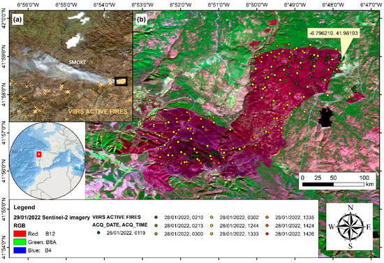 Fire characteristics on 28th January 2022: (a) image of the VIIRS active fires and smoke plume; (b) VIIRS active fires along the burned area.