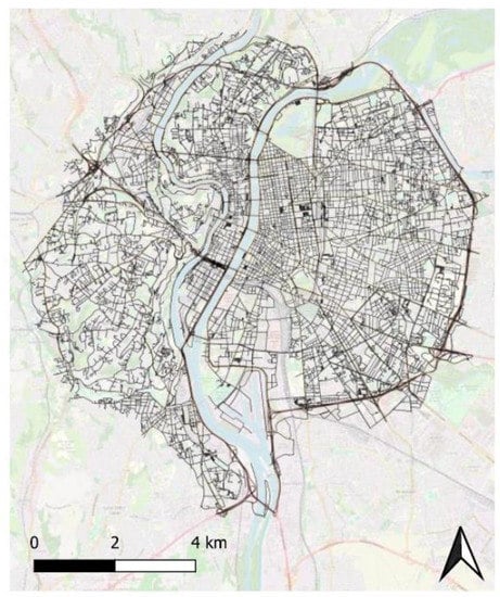 We chose to limit our study to the city of Lyon and its neighboring suburbs (Villeurbanne, Caluire, etc.), which had 960,036 inhabitants in 2017 []. As a result, the area investigated, shown in Figure 1, presents a surface area of almost 100 km2 containing 39,812 links for a total length of 2264 km.