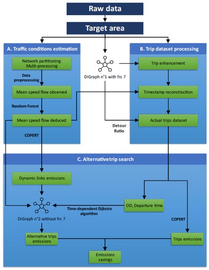The use of GPS traces requires processing to answer the research questions defined in Section 1.3 above. From the GPS traces, it is necessary to extract variables capable of estimating the emissions of a trip and seek a sustainable path. However, these data are incomplete due to the lack of observations on certain links. Thus, several network links do not have speed information every time. In addition, trip records are sometimes sparse, leading to partial trips which are then a challenge when assessing pollutant emissions of actual trips. Moreover, some trips are not interesting to study an alternative path more eco-friendly for a variety of reasons such as finding a place to park, taking the wrong direction, etc. This work proposes a three-part framework to address these challenges. Firstly, a random forest is trained from the partial data to tackle the missing mean speed flow and thus estimate the network traffic condition every fifteen minutes for the whole month of November 2017. Secondly, actual trips are enhanced using a Dijkstra algorithm and selected on the basis of the detour ratio principle in order to construct a reliable trips dataset. Finally, a DiGraph of the network is constructed with pollutant emissions. These emissions are estimated for each interval of fifteen minutes with a COPERT macroscopic emission model based on the average link speed. A time-dependent Dijkstra algorithm is then applied to this DiGraph to find alternative sustainable paths.