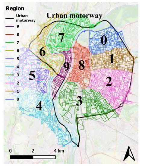 The site studied was divided into eleven distinct regions, including the Lyon urban motorway, to parallelize the machine learning process later. Figure 4 shows the result of the network partitioning process.