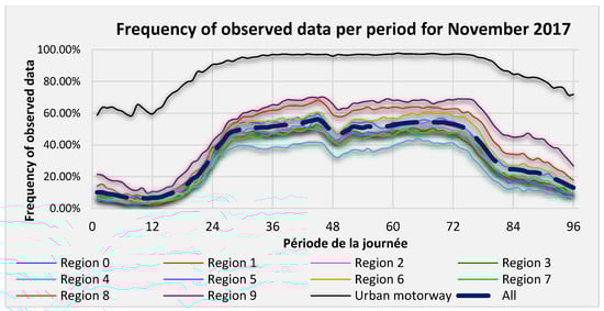 For all regions, there are more data available during the day compared to the night. Except for the urban motorway region, the frequency of observed data ranges from about 5% to 70%. More data are available on the urban motorway region than the others, ranging from about 60% to 95%.