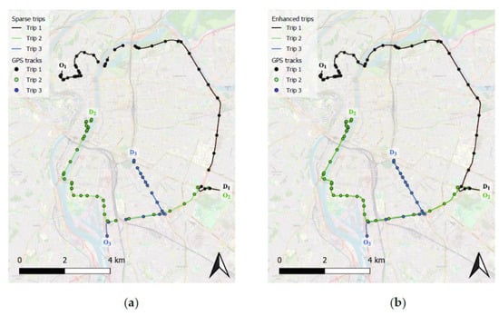 Three typical cases of enhanced sparse trips: (a) the first panel shows sparse trips and their GPS traces; (b) the second panel illustrates the trip enhancement method.