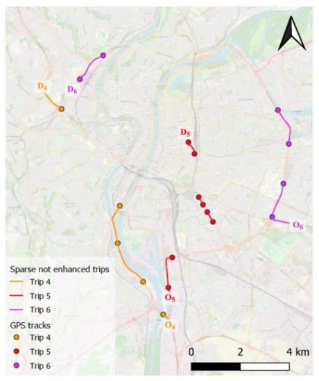 Three typical cases of sparse trips not enhanced (background map: © OpenStreetMap).