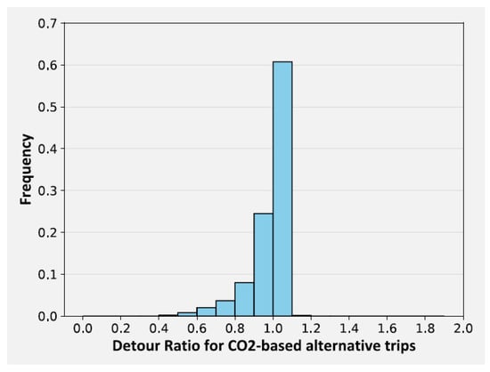 Moreover, the detour ratio method based on Euclidean distance () is computed to keep only trips for which a sustainable alternative may be considered. Indeed, a straight line is often used to indicate the traveled distance. The definition of is provided by Equation (2) below: