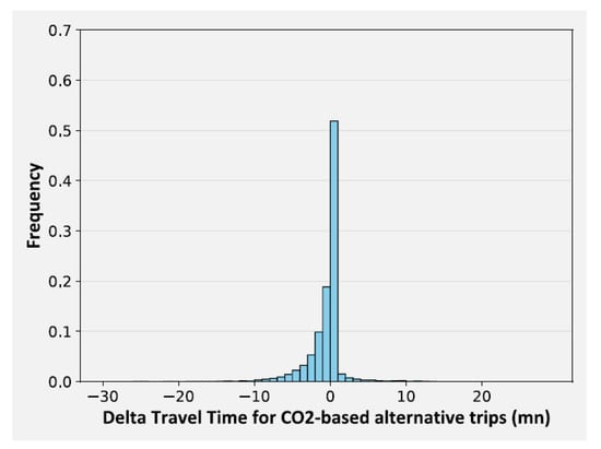 It is noteworthy that some trips may be composed of several ODs (e.g., picking up children at school, making quick purchases, etc.), searching for a long time to find a place to park, taking the wrong direction, or a change in destination, etc. Some trips also start and end at the same location, others are only composed of five links or fewer. However, it often does not make sense to find a more eco-friendly alternative path for these actual trips. Therefore, some trips are ruled out because there is no interest in finding an alternative. Moreover, only trips with a TT longer than five minutes are investigated because there is also a minimum interest in studying an alternative path for short journeys and on the other hand.