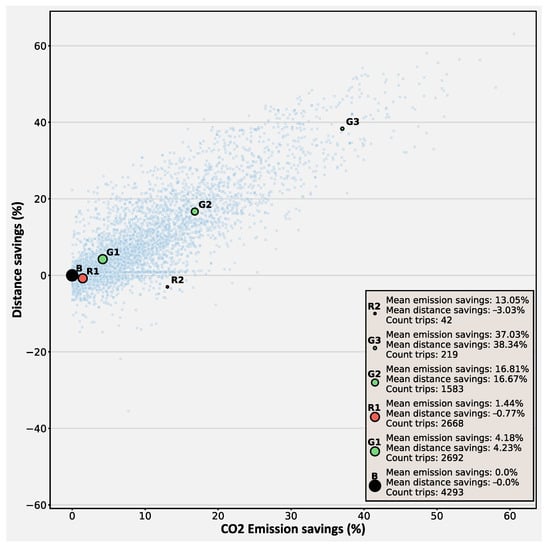 Finally, it is very interesting to emphasize that 414 trips, or about 4% of the dataset, presented emission savings higher than 20% regardless of the emission factor. While the EP could be longer than the SP, these trips were all shorter than those actually made. Indeed, their was between 0.36 and 0.99. Moreover, it can also be seen that their distribution was quite similar for all the days studied, with fewer trips on Wednesdays, weekends, bank holidays, and holidays. This last point may be explained by the distribution of trips presented in Figure 2.