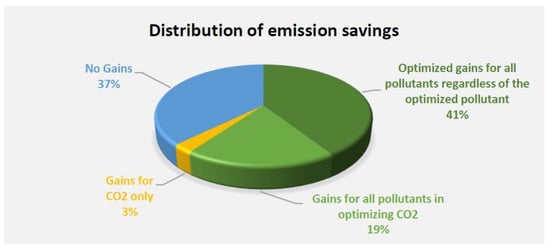 In addition, the multi-pollutant criterion defined in this study seems to be a helpful compromise to optimize all pollutants simultaneously for the mean EFs. The emission savings are always, on average, very close to the optimized gains by using it as an objective. Moreover, this study showed that optimizing NOx may also be a suitable choice to optimize gains for all the pollutants at once.