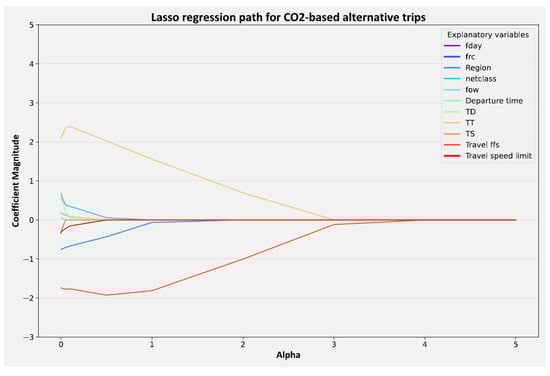 Figure 15 presents the LASSO regression results for alternative trips based on CO2 as a function of the alpha coefficient. Four explanatory features can be seen which could explain emission savings for every pollutant (region, netclass, TT, Travel ffs). The trend is the same regardless of the pollutant optimized by alternative trips. The LASSO regression results for alternative trips are provided for each pollutant in Point S6 of Supplementary Materials. Most of the highest multi-pollutant emission savings were achieved for actual trips using the urban motorway or netclass 2 links (medium importance). These trips had the particularity of being quite long (more than 15 min on average) with a moderate travel ffs (45 km/h on average). Moreover, the LASSO regression highlights regions as one of the four explanatory variables capable of explaining emission savings. This could be justified by the fact that the expected savings are not uniformly distributed in space, which was confirmed in their analysis considering ODs. Consequently, it is noteworthy that trip locations have more impact than their departure time in view to maximize the environmental benefits.