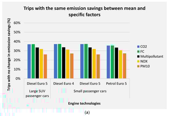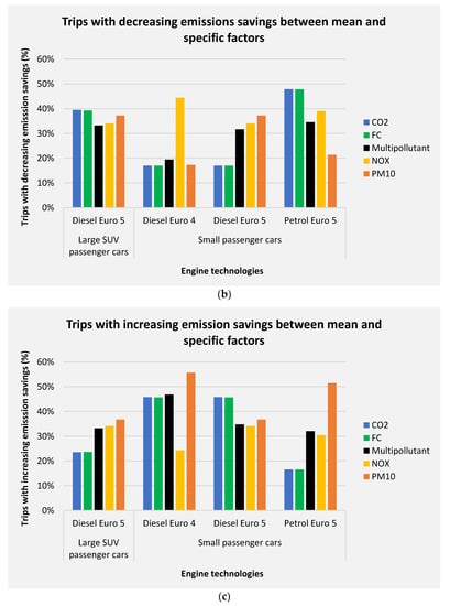 However, when emissions gains of more than 5% were considered, the number of alternative trips found for the specific EF presented the same trend as the mean EFs, regardless of the engine technology, the type of vehicle, and the pollutant optimized. Indeed, there were, respectively, 25–28%, 15–17%, and 5–6% of alternative trips with emission savings above 5%, 10%, and 20% for all the specific EFs. In comparison, there were, respectively, 26–27%, 15–16%, 5–6% of alternative trips with emission savings above 5%, 10%, and 20% for all the mean EFs.