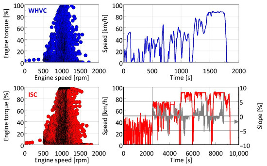 Operating engine maps and speed profiles of the WHVC (top panels) and ISC (bottom panels) test cycles. The slope applied over the ISC is also shown on a separate axis. ISC = In-Service Conformity Cycle; WHVC = Worldwide Harmonized Vehicle Cycle.