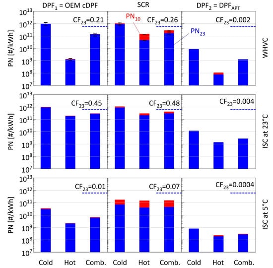 Figure 3 provides a summary of the emission results evaluated according to the Euro VI step E methodology for the tests with the OEM cDPF. The SPN23 emissions of the vehicle in its OEM aftertreatment configuration (SCR out) were found to be below the currently applicable emission limits under all operating conditions.
