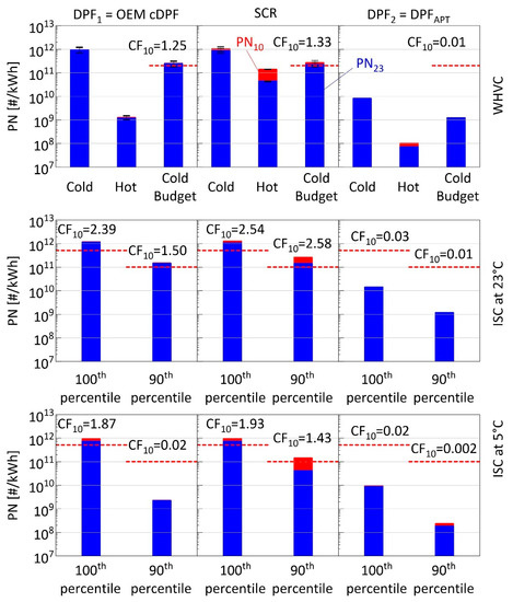 Figure 4 shows the results from the same tests from Figure 3 (OEM cDPF) calculated following the proposed post Euro VI methodology targeting SPN10. The vehicle PN emissions in its OEM aftertreatment layout (SCR out) were above the proposed limits in all tests. It should be reminded that the cold-start tests were conducted having passively regenerated the filter the day before. The WHVC cycle would correspond to a short trip and thus the cold-start test would be weighted by the ratio of cycle work (29 kWh) to three times the reference work (3 × 37.5 = 112.5 kWh), i.e., approximately 26%. Therefore, the 1.0 × 1012 #/kWh WHVC-cold SPN10 emissions would translate to 2.7 × 1011 #/kWh, 33% above the suggested budget limit of 2 × 1011 #/kWh. The average WHVC-hot SPN10 emissions of 1.4 × 1011 #/kWh are already close to the target budget limit. Assuming that they are representative of the hot-start operation, prolonging the WHVC-cold would result in even larger exceedance.