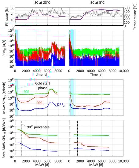 The cold-start sections of the tests, as defined in the Euro VI step E ISC regulation, are also depicted in Figure 6. The requirement to consider only data from the point when the coolant temperature reaches 30 °C, resulted in an exclusion of the first ~200 s of the ISC test conducted at 5 °C, but no exclusion of data for the ISC at 23 °C (as the coolant temperature was 30 °C at the start of the specific test). Given the sharp drop in SPN emissions, the specific difference constituted the low temperature test as a less severe condition. The end effect was an order of magnitude lower cold-start MAW emissions at 5 °C compared to 23 °C (Figure 3).