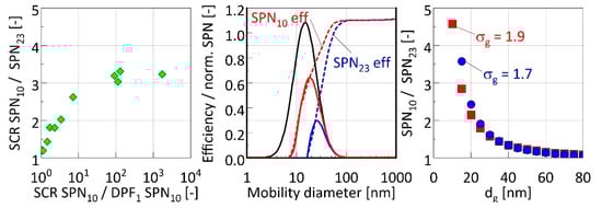 The left panel in Figure 7 summarizes the cycle-average ratios of SPN10 over SPN23 downstream of the SCR as a function of the SPN10 concentration ratios downstream and upstream of the SCR. The former is a function of the mean size of the emitted particles, while the latter is indicative of the relative contribution of particles forming inside the SCR. When particles forming inside the SCR dominate, the SPN10 over SPN23 ratio ranges between 3 and 3.3. As the contribution of particles forming inside the SCR is reduced, so the SPN10 over SPN23 ratio is reduced down to a value of 1.2. Figure 7 also presents calculated SPN10 over SPN23 ratios for different lognormal distributions based on typical counting efficiencies of SPN10 and SPN23 systems [43]. The computations suggest that particles formed in SCR should have a mean size in the range of 15 nm, while in their relative absence the mean size of emitted particles would lie in the 50 to 55 nm range. These figures are consistent with previously reported sizes for particles formed in SCR [31] and HDV soot [44], respectively.
