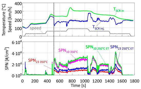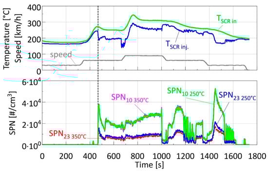 The volatility of the particles formed inside the SCR was assessed during two speed ramp tests. In the first test, two SPN systems (CS1, CS2) were connected at the outlet of the SCR, with one (CS1) set to operate at a VPR temperature of 250 °C (the other had the default temperature of 350 °C). The results of these tests are summarized in Figure 8. A step increase in particle emissions took place midway through the first 60 km/h section. This rise coincided with a sharp drop in the reading of the thermocouple installed close to the tip of the urea injector. Similar SPN10 concentrations were recorded with both instruments over the entire duration of the test. The SPN23 concentrations recorded by the CS1 operating at a VPR temperature of 250 °C were approximately 10% higher than those recorded by the unmodified CS2 (350 °C).