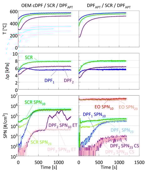 Figure 10 compares the SPN emissions from two passive regeneration tests. SPN measurements downstream of the DPF2 were performed in one test with ET while in the other test with CS3. When ET was employed (left-hand panels), a large increase in SPN10 was observed at ~700 s. By that point, the SPN emissions from all other locations stabilized suggesting consumption of the soot cake. The temperature at the inlet of DPF2 was approximately 500 °C, while even higher temperatures were recorded at the inlet of the DPF1 (550 °C) and the SCR (570 °C). Such release of particles was not observed with the corresponding SPN23 system, suggesting that these were very small particles, most probably formed by re-nucleation of gaseous precursors downstream of the ET. Such events were not observed after switching from ET to CS2, even when installing DPFAPT at DPF1 position (right-hand panel), which further reduced the concentration of soot particles that could act as condensation seeds (thus increasing the nucleation formation potential) by approximately one order of magnitude. Such volatile artifacts at systems employing ET have also been reported by other studies and highlight the need for a CS for sub-23 nm measurements [49,50].