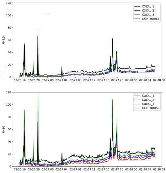 Unfortunately, in the area of study, there is no official reference station to compare data to. We decided, then, to co-locate 3 LCS with a high-quality Lighthouse 3016 IAQ handheld PM probe and compare results from this experiment with those obtained in []. Of course, the limitations of this approach are substantial. In fact, even if we use a high-quality PM sensor, this uses a similar technology to that used in the LCS and, therefore, cannot be considered an absolute reference. The experiment lasted 3 weeks. The sampling rate of the Lighthouse probe was set to 3 min. It was possible to collect approximately 10K measurements. The sampling rate of the LCS was set to 1 min. This resulted in approximately 30K points per each LCS. Later, LCS measurements were synchronized with the reference instrumentation averaging them within each 3-min sampling bin.