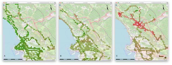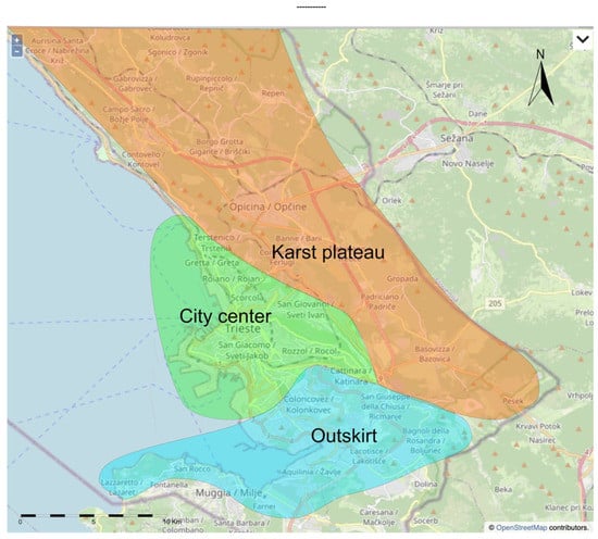 We focussed on the winter period (when the phenomenon appeared) and defined three equidimensional (4 km by 4 km) subzones: one in the city center, one in the outskirts, and one around the village of Opicina (Figure 5 left).