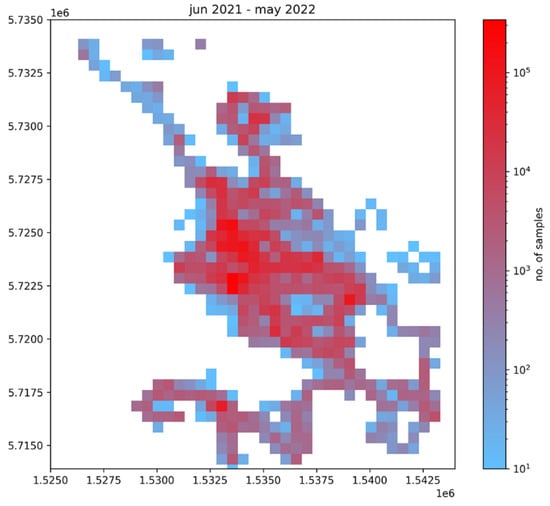 Figure 3 shows the geographic density map of the dataset acquired so far. The distribution in the designated area is very high, although not homogeneous. This largely depends on the distribution of the public transportation network. Bus lines, in fact, are denser in the city center. In the outskirts of the city and the Karst, buses are less frequent, and the routes are sparser.