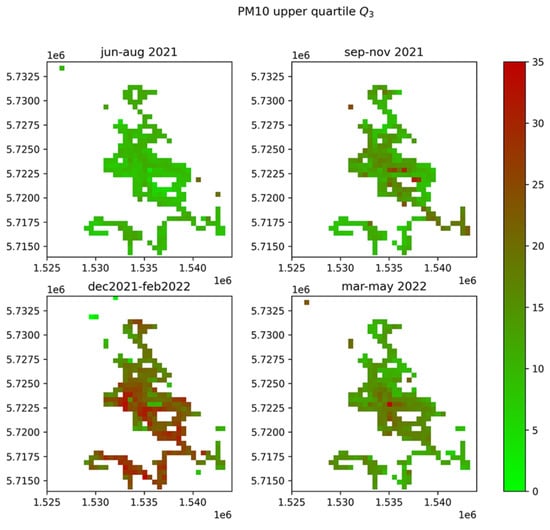 In this perspective, we superimposed on the data a regular grid of 500 m by 500 m cells. We then gathered data in four-time subsets corresponding approximately to summer, autumn, winter, and spring seasons. Within each cell, we then calculated the third quartile of the distribution of PM values for each time subset (Figure 4).