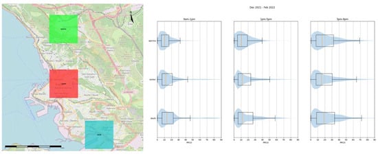 Map of the designated area highlighting the three subzones that have been considered for the analysis (left) Matrix of violin plots showing the trends of PM distribution during three time intervals of the day from December to February 2022 (right).