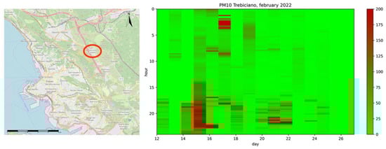 On the contrary, bus-based measurements were much more reliable, continuous, and with high time and geographic coverage. In the designated area, the bus service starts at 5 a.m and stops at midnight. The five-hour gap during the night is generally not critical. Data available from governmental environmental agencies and numeric simulations show, in that time range, a smooth decrease in PM concentrations []. Only very rare anomalous events relevant to air quality studies have been identified in the period considered for this work. The operating time range of the bus service guarantees that most PM emissions related to human activities can be correctly considered.