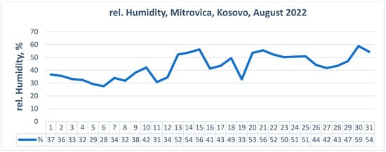 In recent years, there has been a trend of decreasing lowest relative humidity data in the summer months. In addition, the humidity data have varied from season to season. The relative humidity data during the last 5 years for the Mitrovica region are presented in Figure 3.