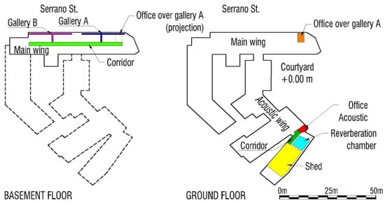 The galleries are in the main wing, behind the west façade. They are two symmetrical areas, with an axis of symmetry in the middle of the main entrance (Figure 2). Gallery A is in the north position, and Gallery B is in the south. Both spaces are T-shaped. The two galleries are physically independent.
