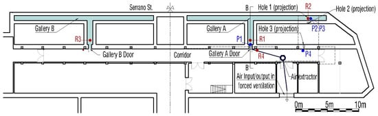 All the radon mitigation techniques were conducted in Gallery A. The data were recorded in both galleries to detect the possible effects on this space due to possible underground connections. Although there is a distance of several meters between the two spaces, the dimensions of the system of tunnels and galleries under the buildings forming Serrano Street were not clear.