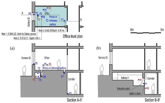 Positions of spaces and sensors. (a) Office plan and section A-A′, with Gallery A and corridor. (b) Section B-B′: Gallery A, passage section, and neighbor spaces. Radon sensors (R) are highlighted in red. Pressure sensors (P) are highlighted in blue.