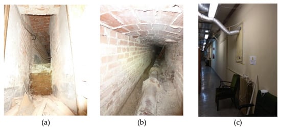 The galleries are slightly below the street level. The corridor is around 1.30 m below street level (Figure 3). Both galleries were built as facilities and equipment spaces, each with a small door leading to the basement corridor. The enclosure of the galleries is solid brick (Figure 4). The unknown state of conservation of the galleries prevents entry for an in-depth assessment.