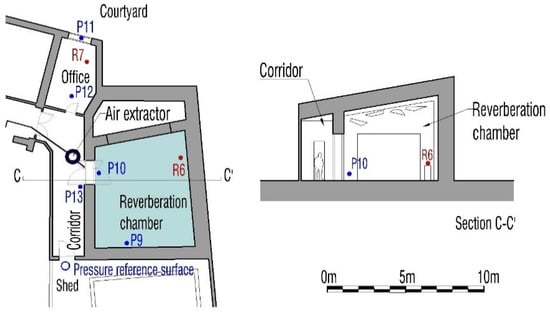 Positions of spaces and sensors. Acoustic wing and reverberation chamber section. Radon sensors (R) are highlighted in red. Pressure sensors (P) are highlighted in blue.