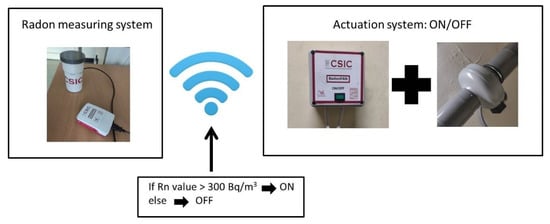 A wireless system was designed and developed by the authors to extract radon gas from the interior of buildings. This system is composed of 2 subsystems: the system in charge of monitoring the radon data (radon measuring system) and the system for activating or deactivating a fan to extract the gas (actuation system). An IoT protocol called MQTT is used to communicate between both systems.
