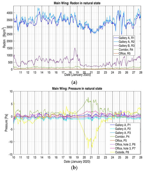 As can be seen in Figure 8a,b, the pressure and radon values developed a cyclical daily period. Both galleries had very similar pressure trends. The galleries were not isolated, and there is no information about the connections to other underground spaces or city galleries. Cyclical periods can be influenced by ventilation or connection to other underground spaces, heating in the building, or human activity. On the other hand, radon levels decrease when the outside pressure is lower than the inside pressure (outside—P8 pressure sensor). The pressure recorded outside shows an influence of the wind during those days. The office window was placed leeward, and the wind created suction. In opposition, the windward corridor was affected by positive pressurization. High wind rates affected the air in the galleries and indoor spaces, changing the radon levels.