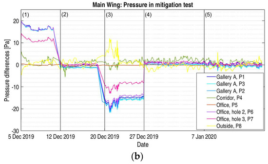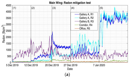 The mitigation tests are described in Section 3.1. Each test lasted for at least a whole week. Figure 9a,b shows the impact of the mitigation test on the radon levels and the pressure variation at each space. Test (5) recorded the natural states of the spaces without the activation of the mitigation systems.