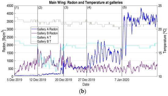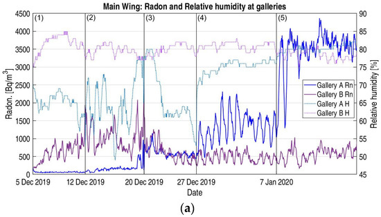 Regarding the temperature (Figure 10b), thermal inertia prevents sudden changes in temperature. This makes it difficult to determine the link between the temperature and radon levels. The temperature gradient in Gallery B was only 2 °C. The pressurization (1) and depressurization (3) tests did not appear to affect the temperature. Air renewal, as in the forced cross-ventilation test (2), equalized the temperature to the outside, avoiding the effects of thermal inertia. It is worth noting the 4 °C difference between the temperature in Galleries A and B, emphasizing the difference between both spaces.