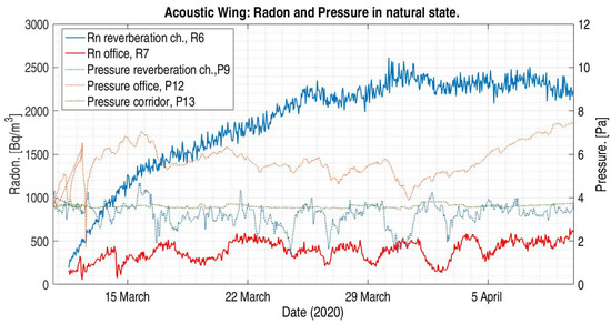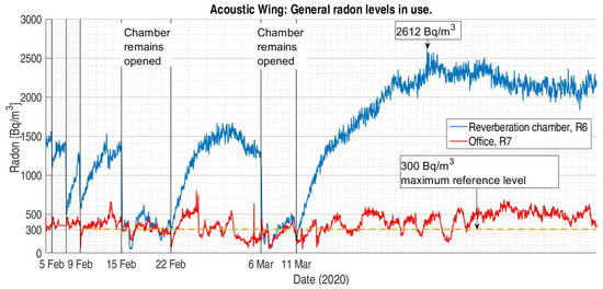 The reverberation chamber and the office remained in use during the data logging. The work in the reverberation chamber requires complete closure of the space. Although natural ventilation of the chamber quickly reduced the indoor radon levels to less than 300 Bq/m3, once the communication with the outside was closed, the radon levels quickly recovered. Figure 11 shows the radon levels during a typical work period. The vertical lines mark the dates when the reverberation chamber was opened and ventilated. During the work periods, the reverberation chamber was opened or closed at any time. At the same time, the radon levels were influenced by the ventilation of the adjacent spaces, such as the office, corridor, and shed. These actions were not controlled. After 11 March, the reverberation chamber remained completely closed due to work stoppage during the coronavirus disease 2019 lockdown order. This inactivity period made it possible to determine the maximum radon levels that can be reached inside the reverberation chamber. The maximum, 2612 Bq/m3, was reached on 30 March at 4:58 A.M. Due to the lack of contact between the reverberation chamber and the outside spaces, the radon levels were mainly influenced by the radon concentrations, pressure, and soil conditions.