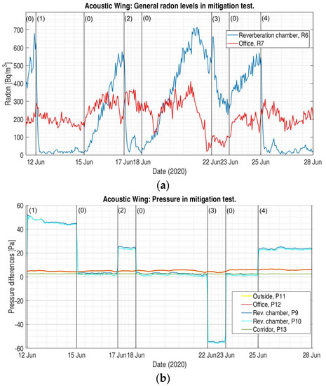 (a) Radon levels measured in the acoustic wing. (b) Pressure measures in the acoustic wing. (0) Initial state and setting of recovery levels. Reverberation chamber closed. (1) Pressurization test, (2) forced ventilation test, (3) depressurization test, (4) forced ventilation test (repeated).