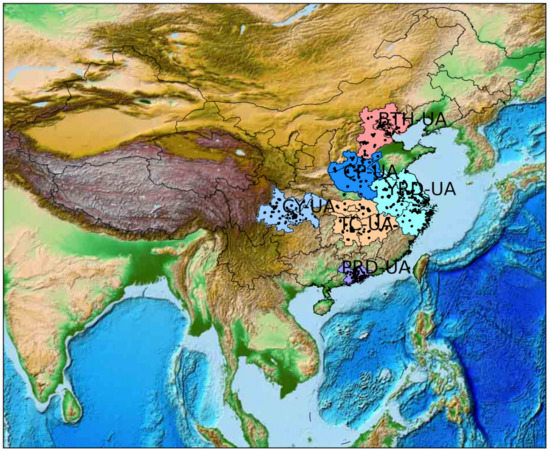 As displayed in Figure 1, six major regions in China were included in this study, i.e., Beijing–Tianjin–Hebei urban agglomeration (BTH-UA), Central Plains urban agglomeration (CP-UA), Yangtze River Delta urban agglomeration (YRD-UA), Triangle of Central China urban agglomeration (TC-UA), Chengdu–Chongqing urban agglomeration (CY-UA), and Pearl River Delta urban agglomeration (PRD-UA). BTH-UA is the capital economic circle of China [4], located in northern China, including two megacities, Beijing and Tianjin. BTH-UA is the region with the most serious PM2.5 pollution in China. CP-UA is the largest urban agglomeration in Central China and an important growth pole of China’s economy [37]. Due to rapid industrialization and large consumption of energy, the CP-UA is burdened by serious air pollution problems [38]. Zhengzhou is the regional central city of the CP-UA. YRD-UA is located in the lower reaches of the Yangtze River in China and is one of the most economically developed zones [6], including Shanghai, Nanjing, Hangzhou, Hefei, Wuxi, Suzhou, and other cities. The TC-UA [39], a new pillar of China’s economic development with a unique ecosystem, also suffers from severe air pollution due to intense anthropogenic emissions. The TC-UA has 31 cities, including Wuhan, Changsha, and Nanchang. CY-UA, located in western China, including two metropolises, Chengdu and Chongqing, frequently experienced serious PM2.5 episodes due to the low atmospheric environmental carrying capacity [29]. PRD-UA [40], an important economic center, is located in the coastal part of southern China, including megacities Guangzhou and Shenzhen. The regional air pollution caused by photochemical smog and haze fog has become an urgent environmental problem in the PRD-UA [40].