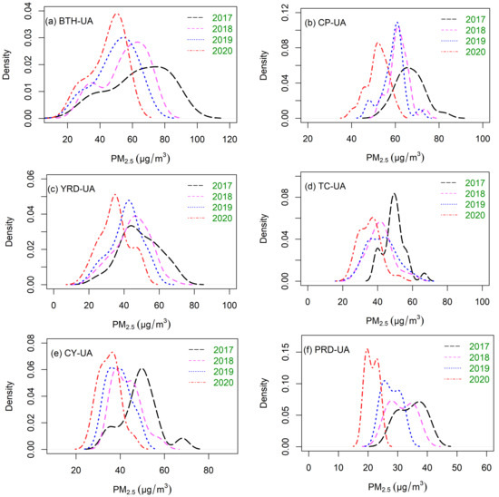 Kernel density estimates of yearly average PM2.5 concentrations in six urban agglomerations of China. (a) BTH-UA, (b) CP-UA, (c) YRD-UA, (d) TC-UA, (e) CY-UA and (f) PRD-UA.