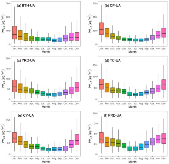 Monthly average mass concentration of PM2.5 in six urban agglomerations of China over the period of 2017–2020. Shown are the median (central horizontal bar within the boxes), 25th and 75th percentiles (lower and upper bars of the boxes, respectively), and minimum and maximum (lower and upper whiskers, respectively). (a) BTH-UA, (b) CP-UA, (c) YRD-UA, (d) TC-UA, (e) CY-UA and (f) PRD-UA.