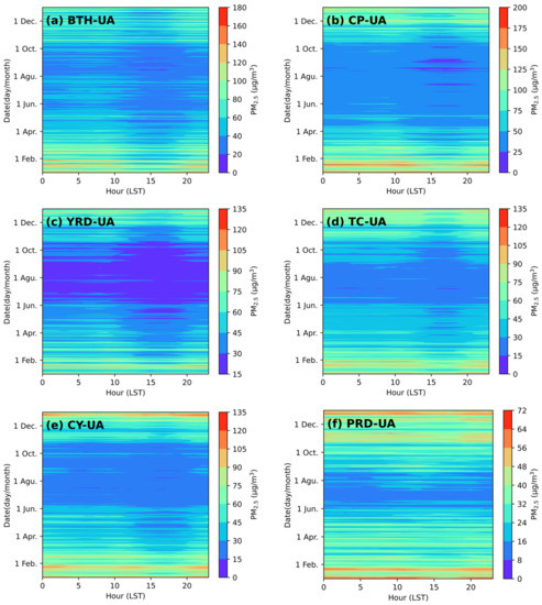The hourly concentrations of PM2.5 were the highest in the CP-UA and the lowest in the PRD-UA, while the YRD-UA, CY-UA, and TC-UA showed minimal differences (Figure S3). As displayed in Figure 4, the diurnal variations in six regions exhibited some similar characteristics. PM2.5 had low concentrations in the daytime and high concentrations in the nighttime. Higher diurnal PM2.5 concentrations were observed in winter than that in summer. In the daytime, due to solar radiation, atmospheric instability was enhanced, resulting in increasing PBLH. The PM2.5 concentrations decreased in the period 8:00–10:00 (LST) in all regions except in PRD-UA, which decreased from 12:00 (Figure S3). The PM2.5 valley concentrations occurred at around 15:00–17:00. Then, the PM2.5 concentrations increased substantially. In the nighttime, descending PBLH, weakening winds, and enhancing atmospheric stability increased PM2.5 concentrations. On winter nights, PM2.5 pollution was more likely to occur [53,54]. From 0:00 to 06:00, PM2.5 concentrations showed increasing trends in CP-UA and YRD-UA, and showed decreasing trends in TC-UA, CY-UA, and PRD-UA. These differences suggested the complexity of the spatial distribution characteristics of PM2.5.