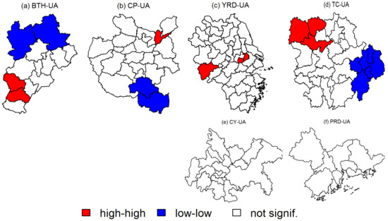 To reveal the PM2.5 features of an urban spatial agglomeration within a region, the local Moran’s I was employed to identify the spatial pattern. After calculating the local Moran’s I, the Moran scatter plot was employed to discuss the local spatial agglomeration pattern of PM2.5 in each urban agglomeration. Moran scatter plot has four quadrants, namely four spatial association modes [37,45]: the first (third) quadrant is cities with high (low) PM2.5 concentrations, which suggests high–high (low–low) agglomeration. The second (fourth) quadrant indicates that the cities with low (high) PM2.5 concentrations are surrounded by cities with high (low) PM2.5 concentrations, suggesting low–high (high–low) agglomeration.