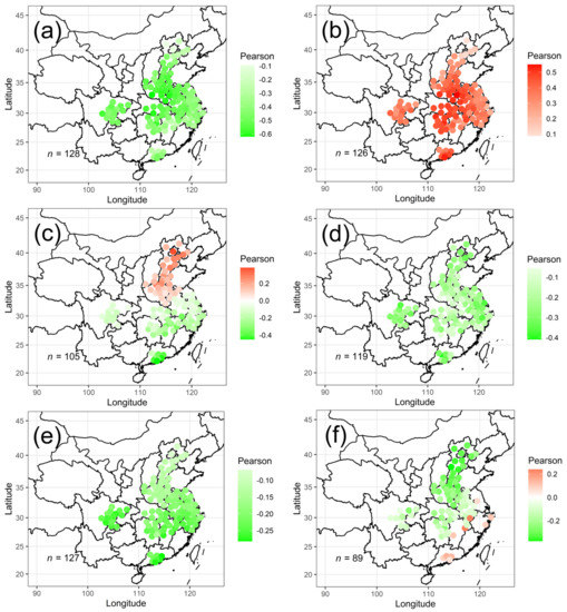 The Pearson coefficient values in six urban agglomerations during the period of 2017–2020: (a) correlation between PM2.5 concentration and T; (b) correlation between PM2.5 concentration and P; (c) correlation between PM2.5 concentration and RH; (d) correlation between PM2.5 concentration and WS; (e) correlation between PM2.5 concentration and Pre; and (f) correlation between PM2.5 concentration and SSD. n refers to the number of sites that pass the significance test at a 95% confidence level.