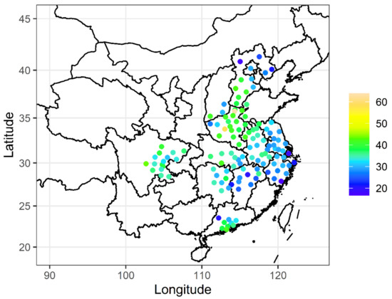 The daily meteorological conditions in 129 cities during the period of 2017–2020, including air temperature (T), atmospheric pressure (P), RH, wind speed (WS), precipitation (Pre), and duration of sunshine (SSD), were obtained from the weather monitoring network of China Meteorological Administration (http://data.cma.cn/, accessed on 31 August 2022).